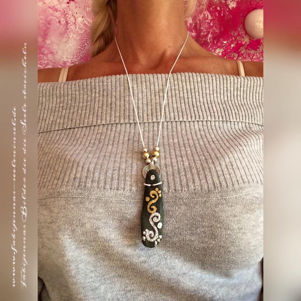 Der bemalte Kraftanhänger ist von mir durchgebohrt und auf einer Weise Kordel mit 1 Spiralen Anhänger, 4 Metallperlen, 2 KunststoffPerlen aufgehängt. Die Steinanhänger sind mit Acrylfarben bemalt, Glitzer bestreut und mit einem wasserfesten Lack versiegelt.